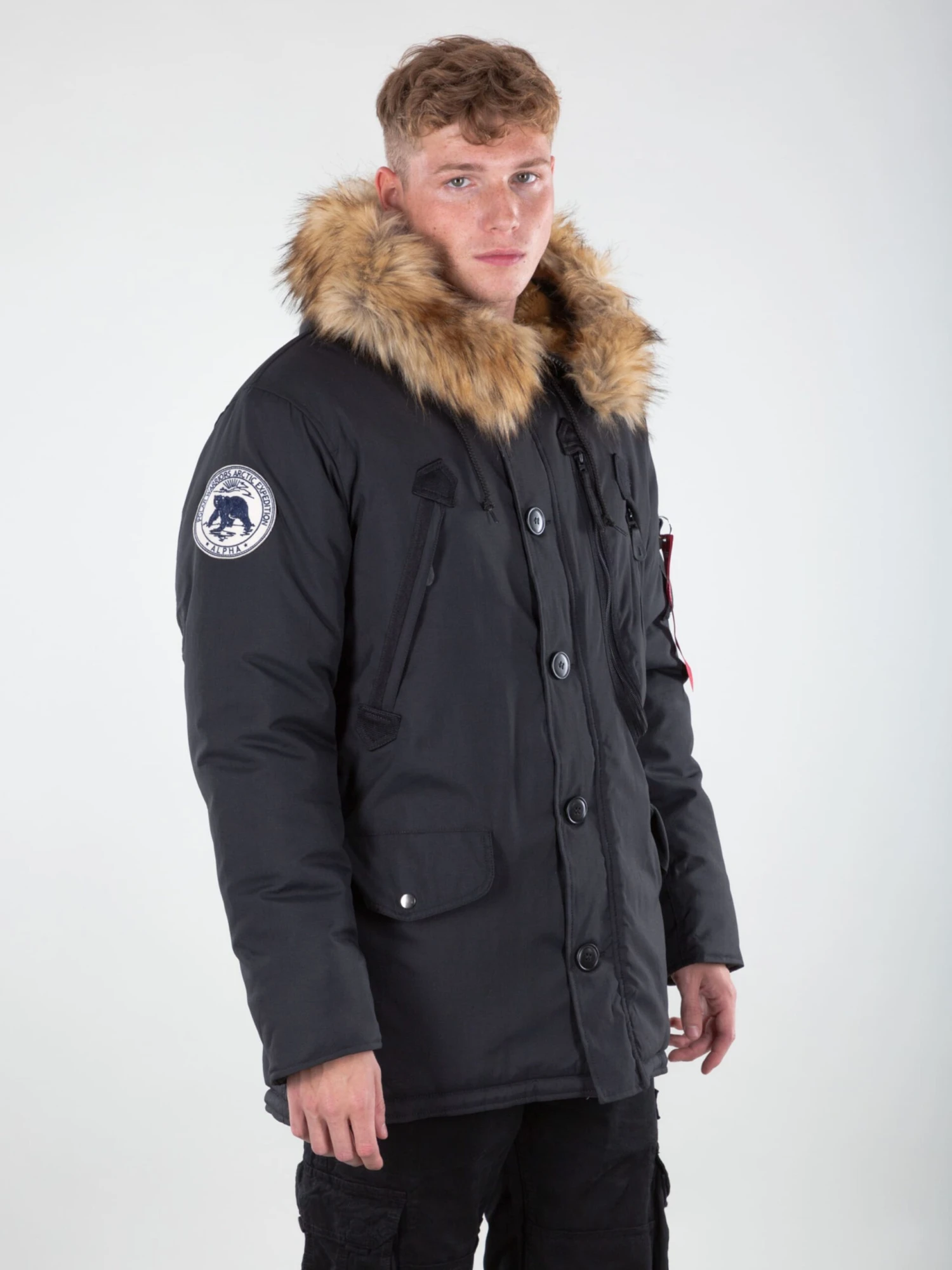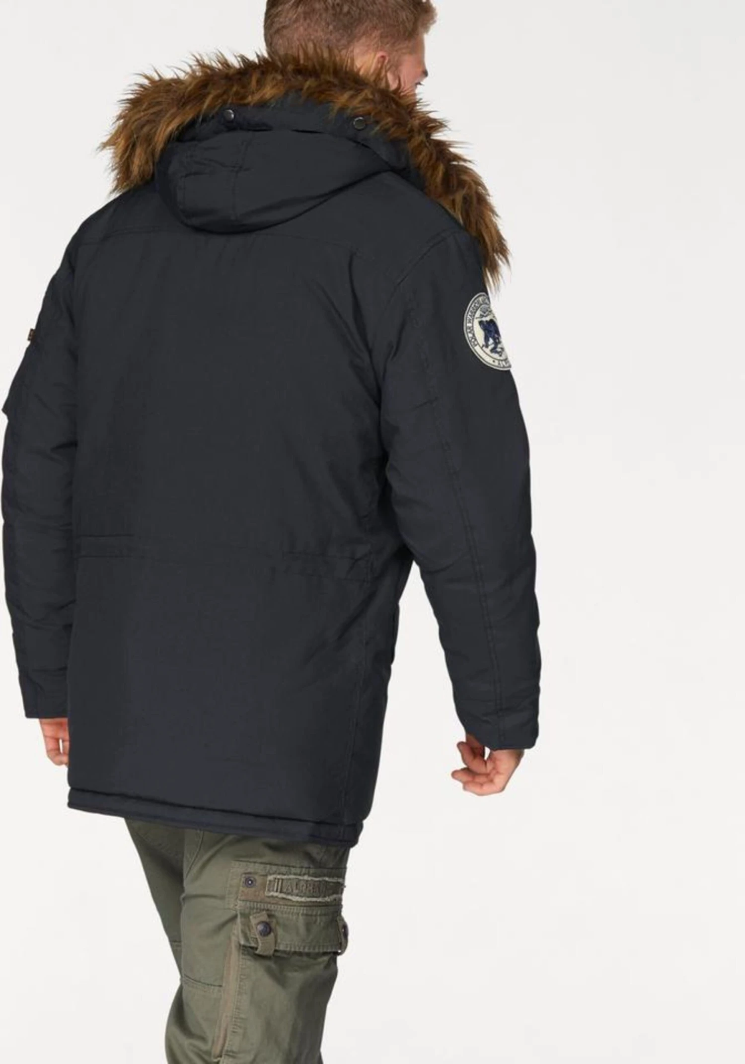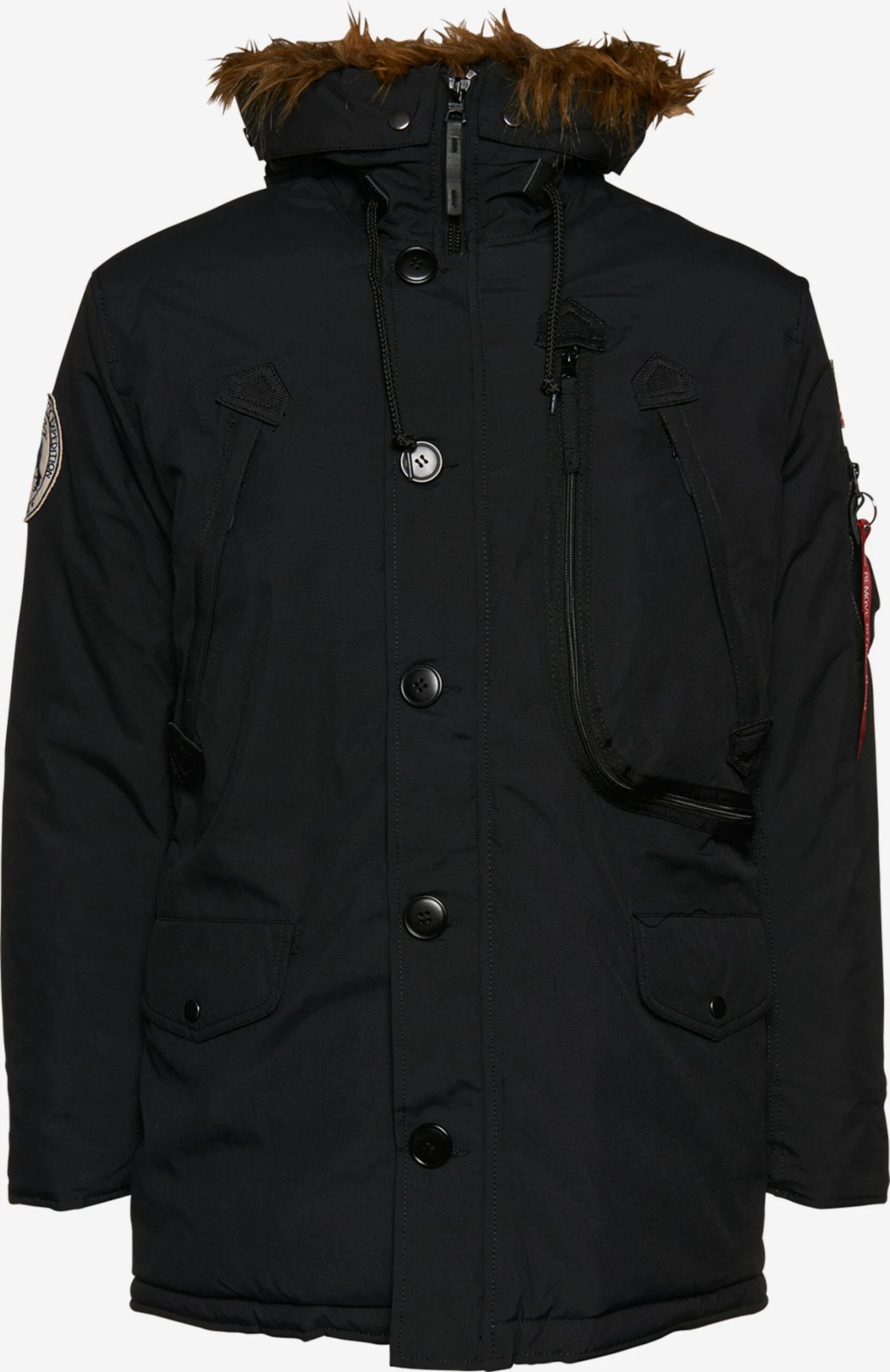 EffenCapuchon met nepbont kraagKnop placketVerborgen ritsMouwzakOpzet-/flapzakLabel patch/label flagStevige stofWarm gevoerdRitssluiting
