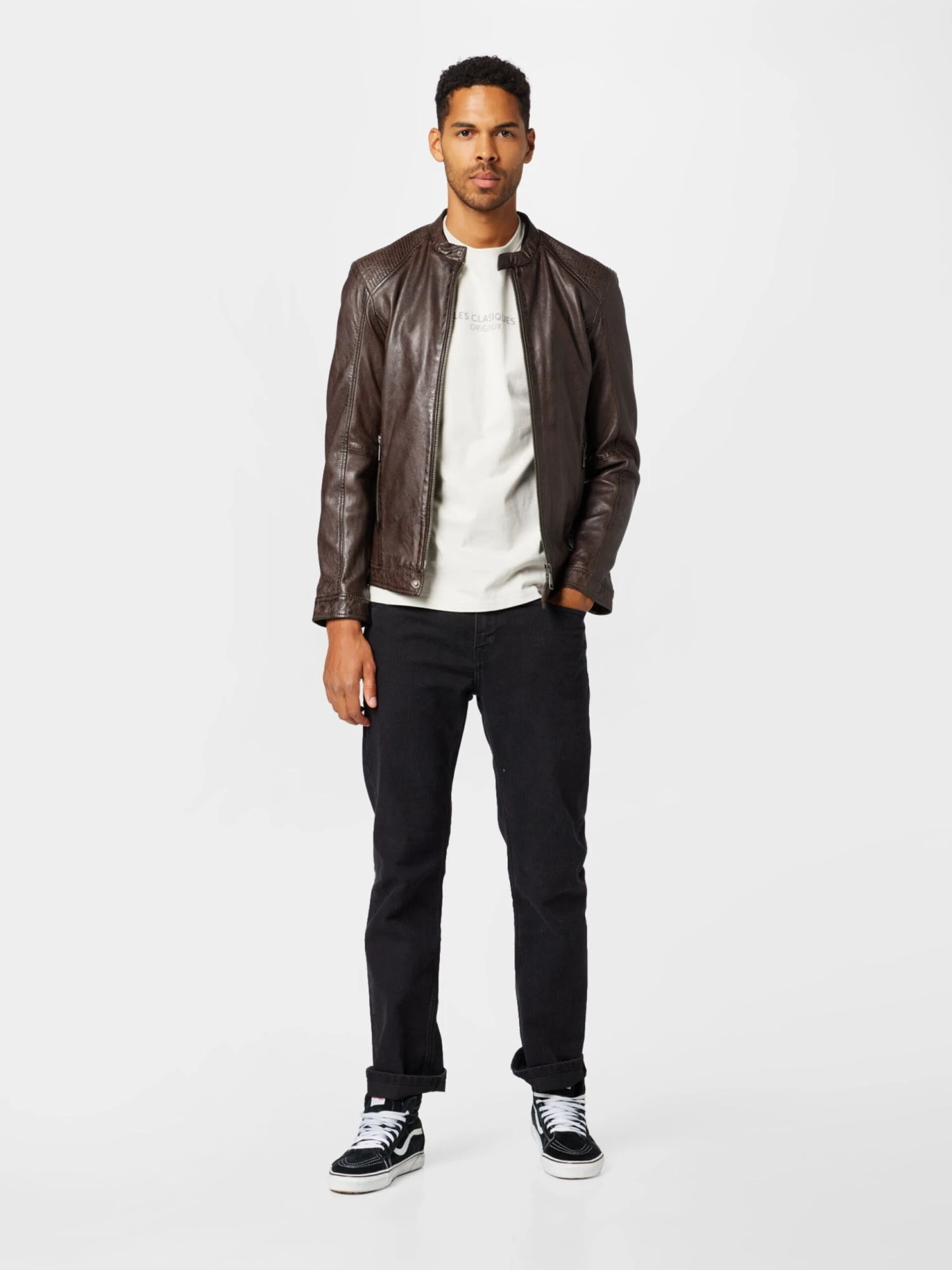 EffenLeerBikerjackDrukknopenStaande kraagRitszakken aan de zijkantStikselsOp staal nadenUsed-lookGladde stofStevige stofLicht gevoerdRitssluitingChroomvrij gelooid leer