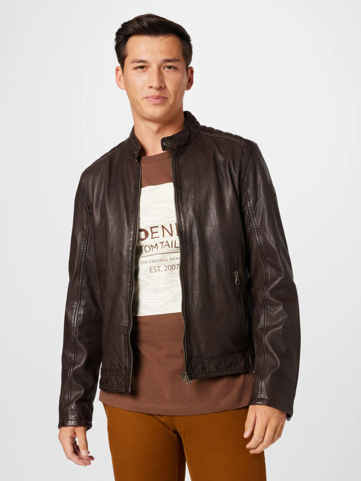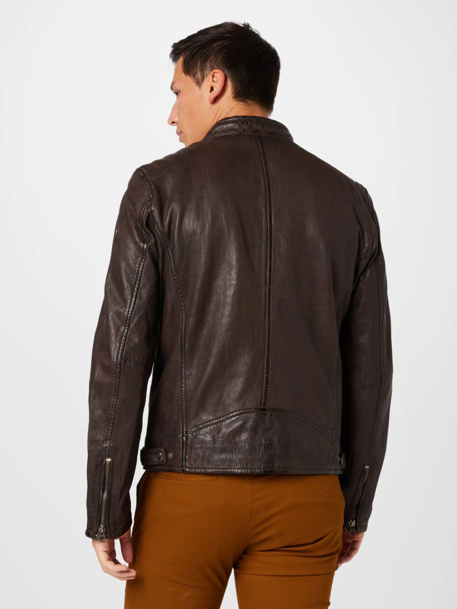 EffenLeerBikerjackRechte zoomStaande kraagRitszakken aan de zijkantOp staal nadenStevige stofLicht gevoerdRitssluitingChroomvrij gelooid leer