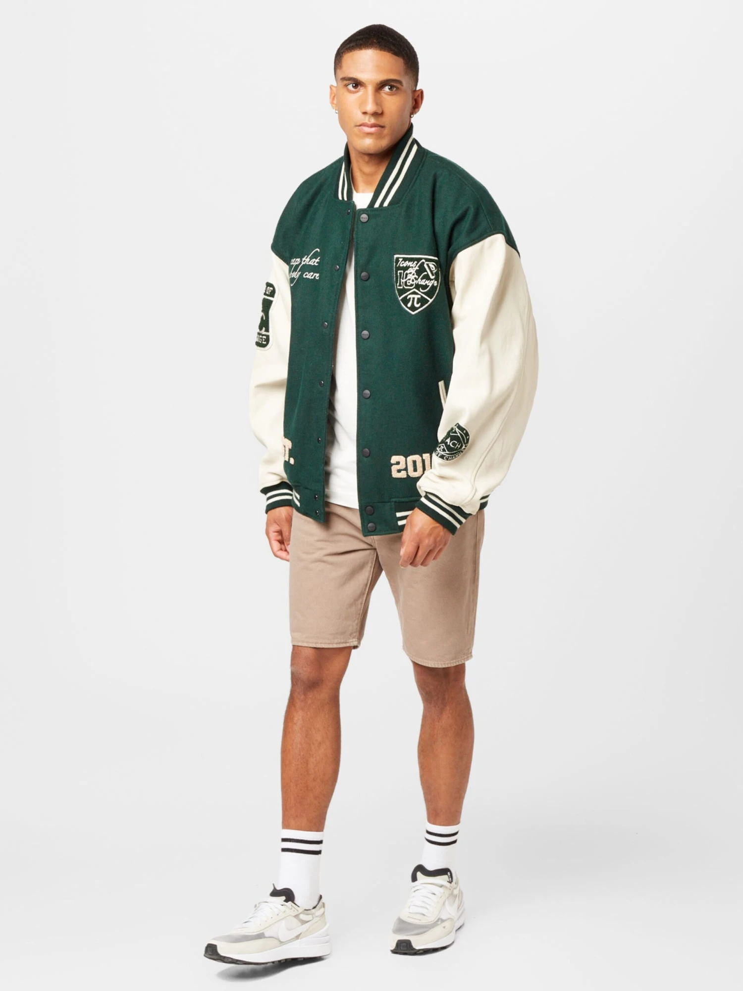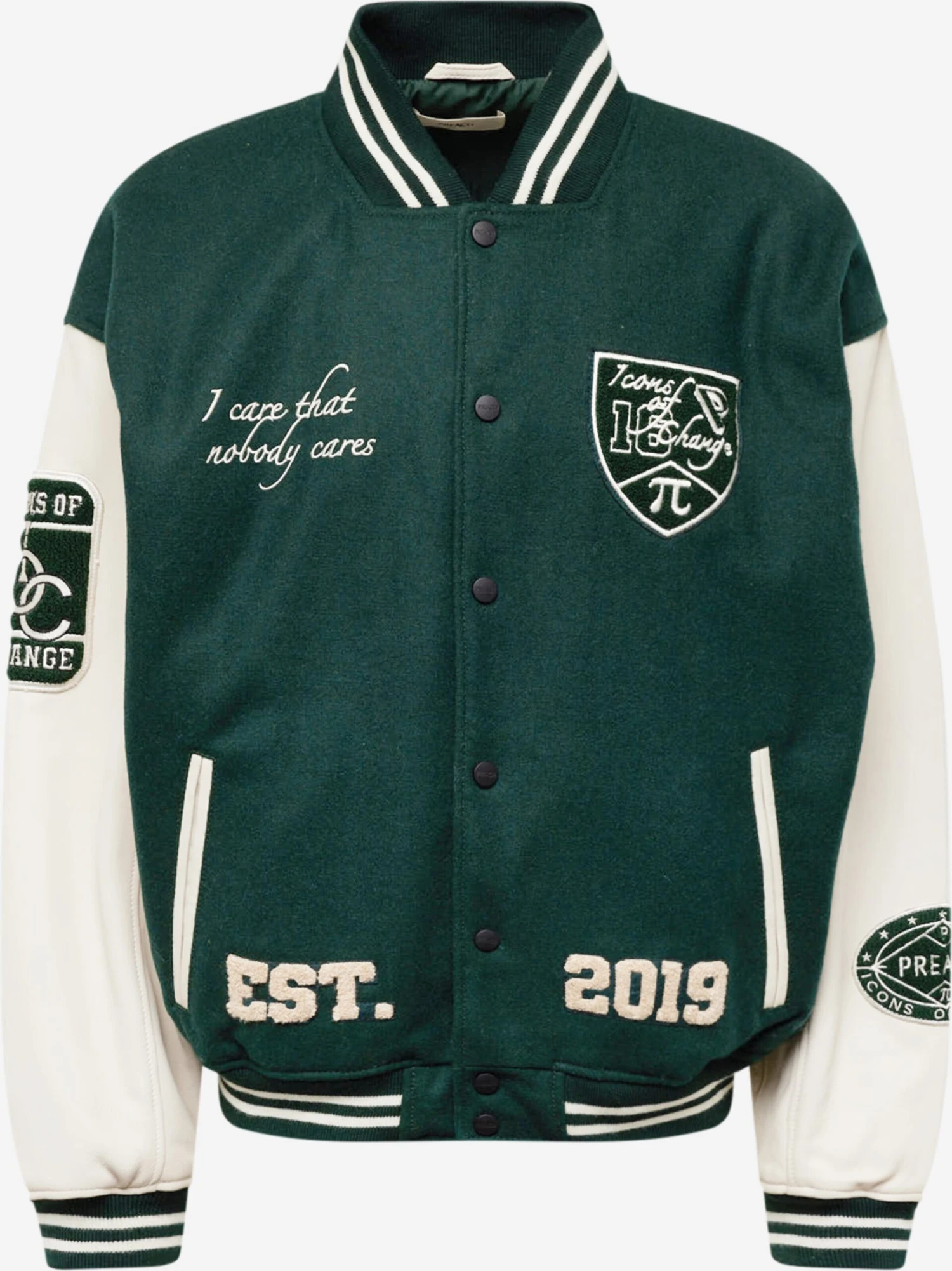 MottoprintLeerCollege jacketGeribbelde kraagGeribd ceintuurtjeZakken aan de zijkantMateriaal mixLabel patch/label flagOp staal nadenLicht gevoerdDrukknoop
