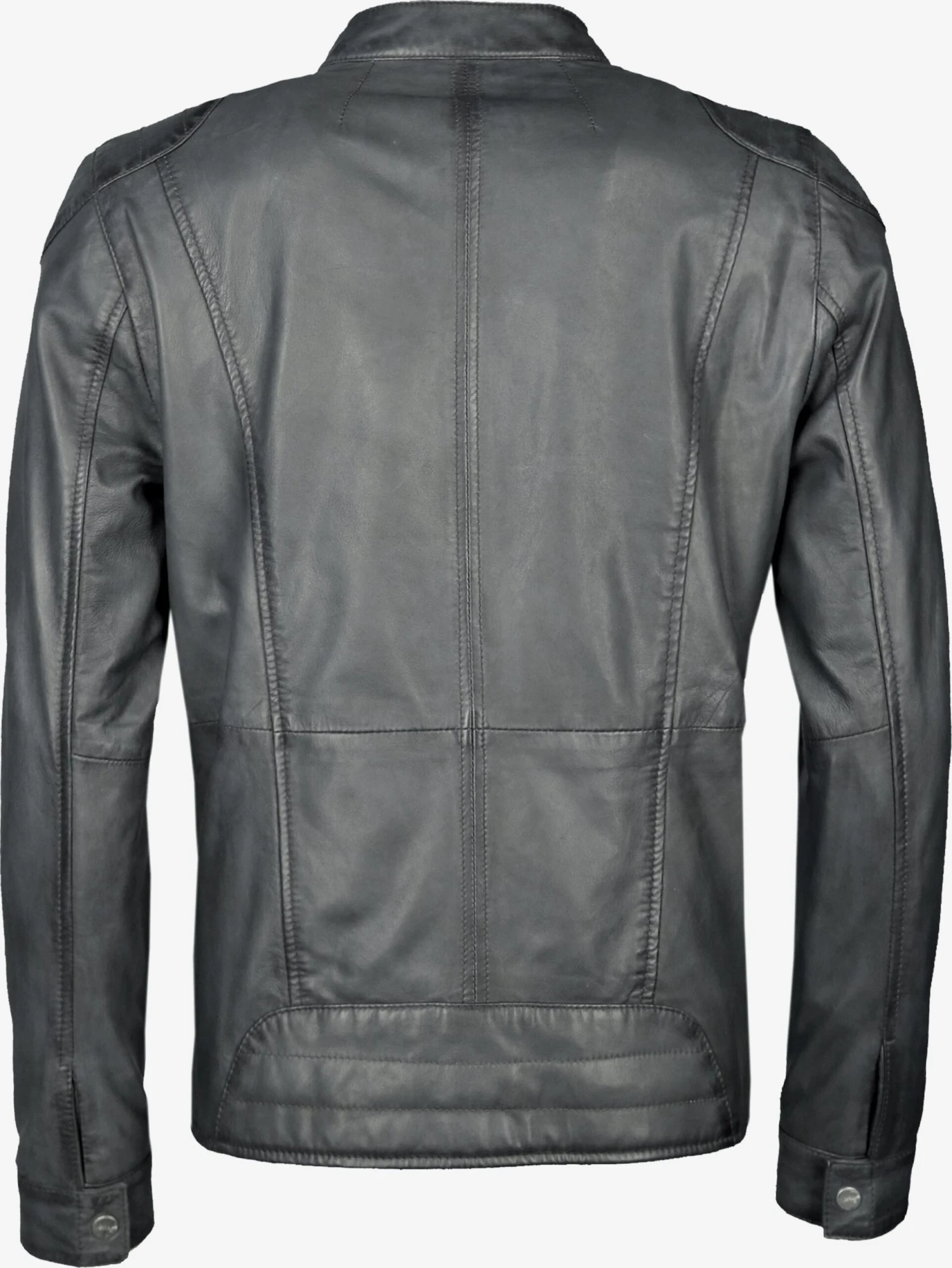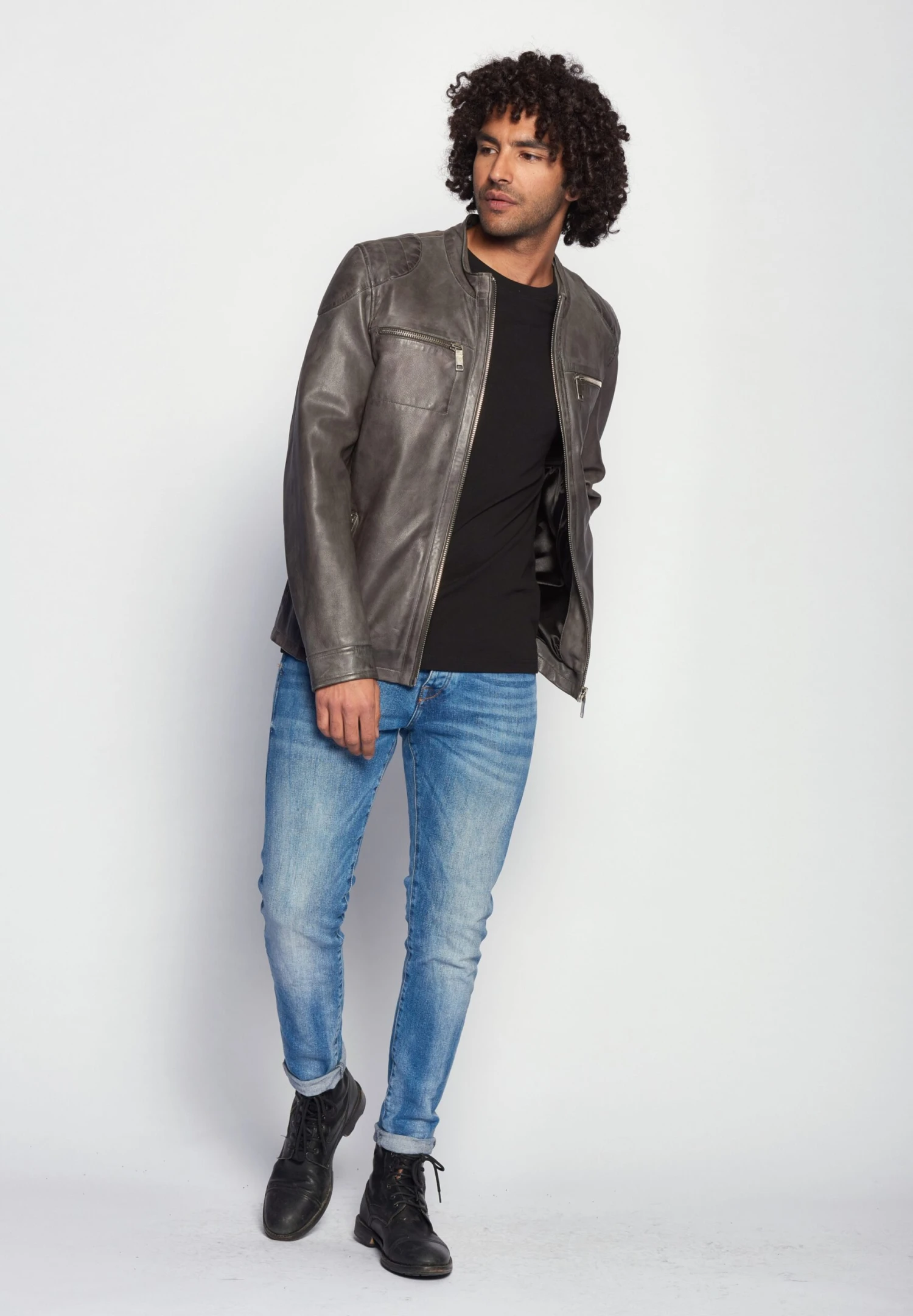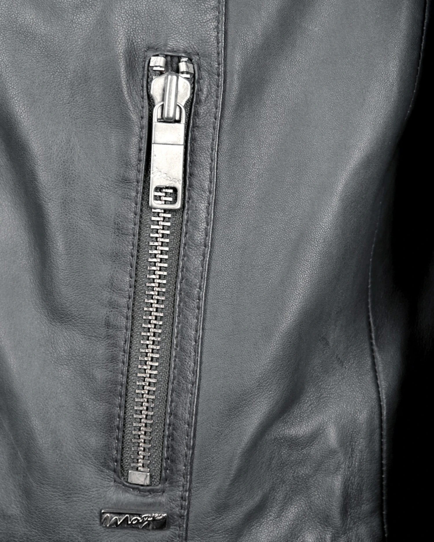 EffenLeerBikerjackRitssluitingRecht modelStaande kraagBorstzakRits zakZakken aan de zijkantKnop sluitingStudsStikselsOp staal nadenNappaleerLamsleerLicht gevoerdRitssluiting