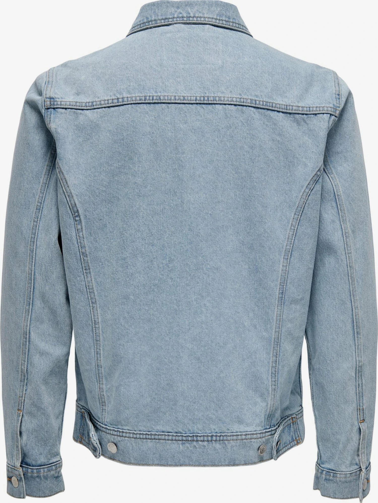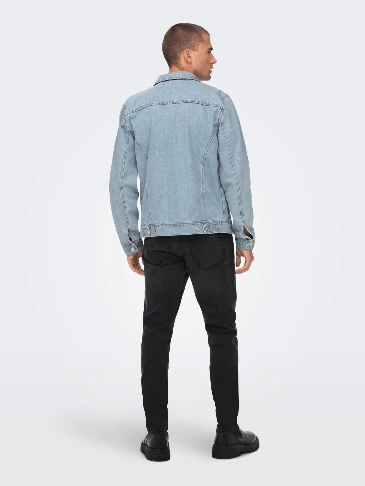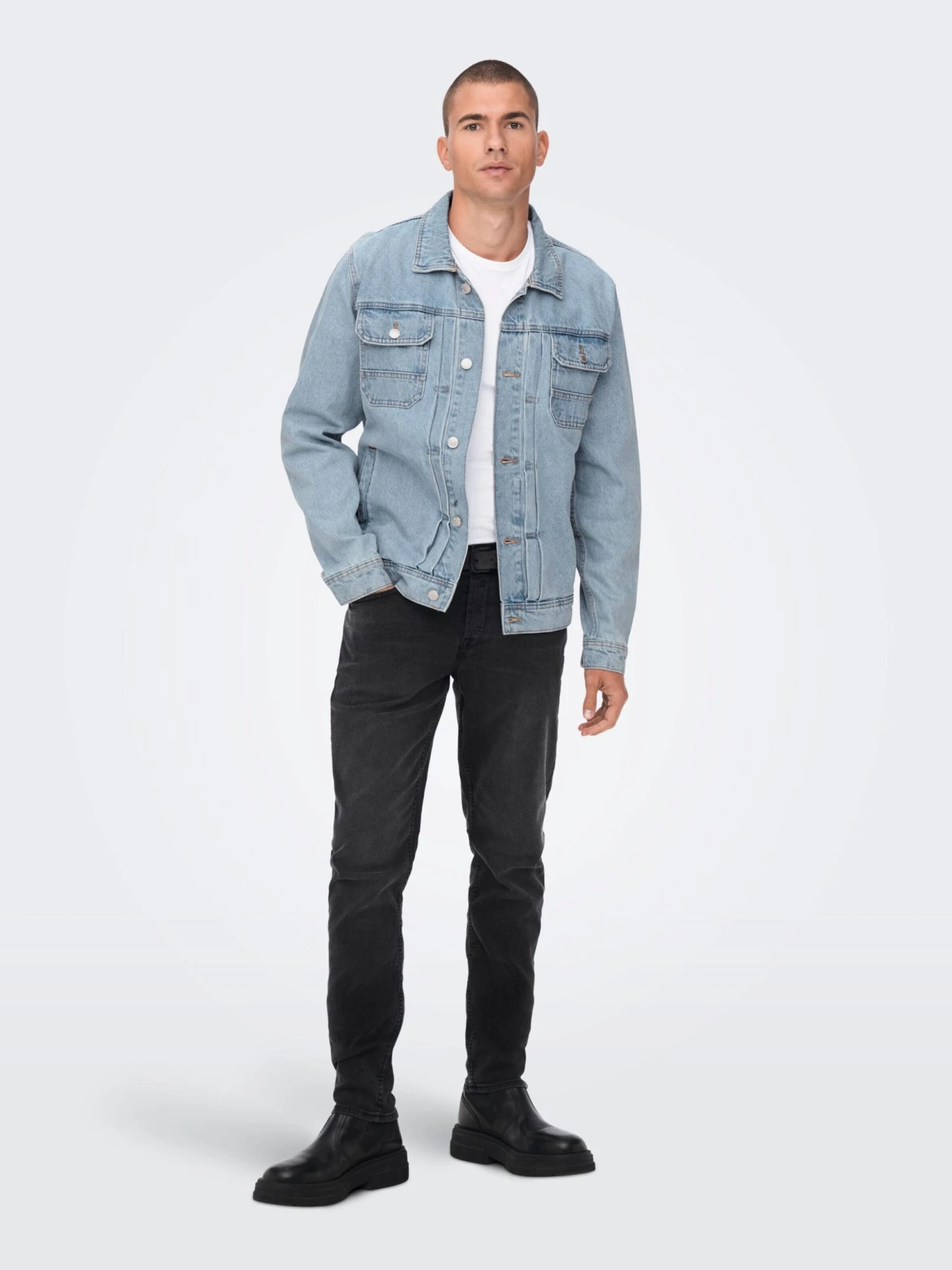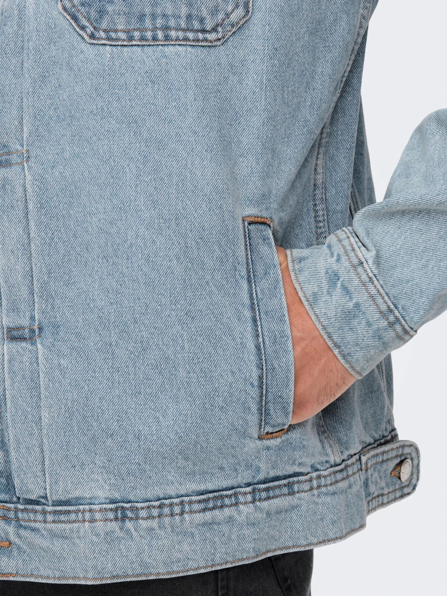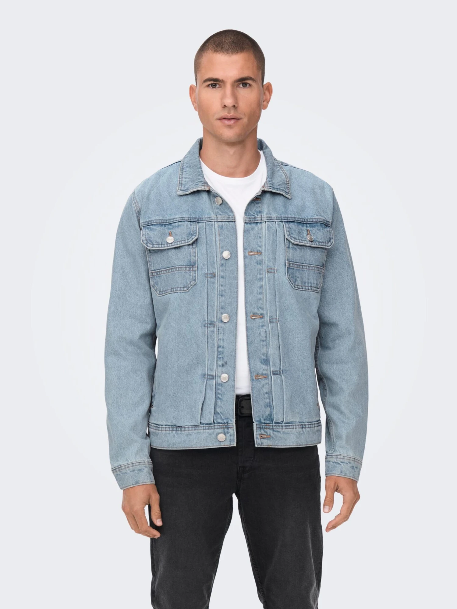 EffenDenimRechte zoomTurn-down kraagOpgezette zakkenBorstzakZakken aan de zijkantContrasterende nadenGewassen effectVaste gripNiet gevoerdKnoopsluiting