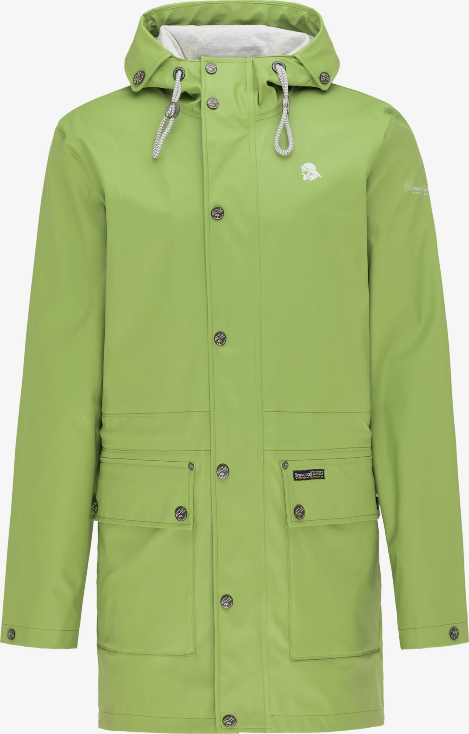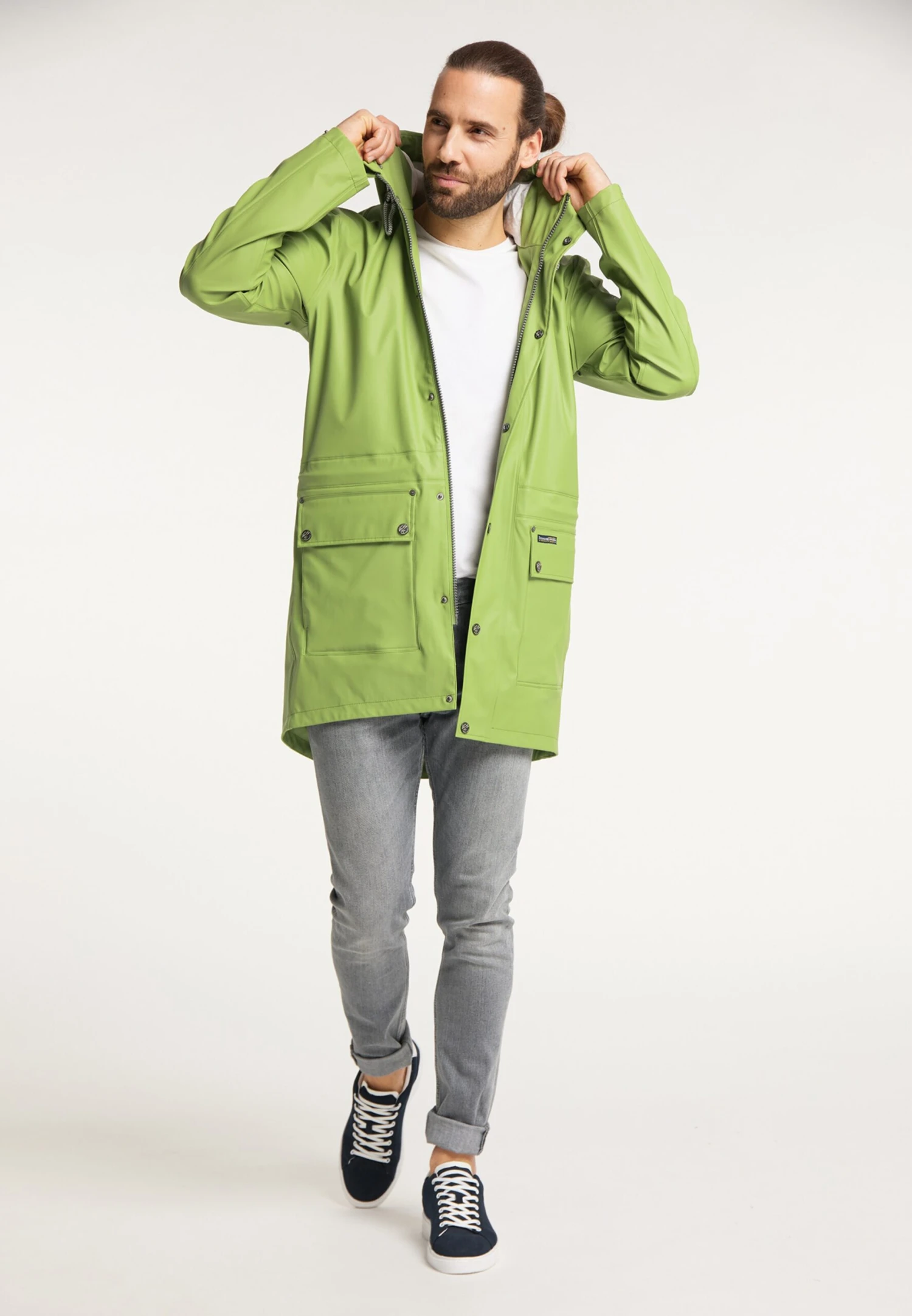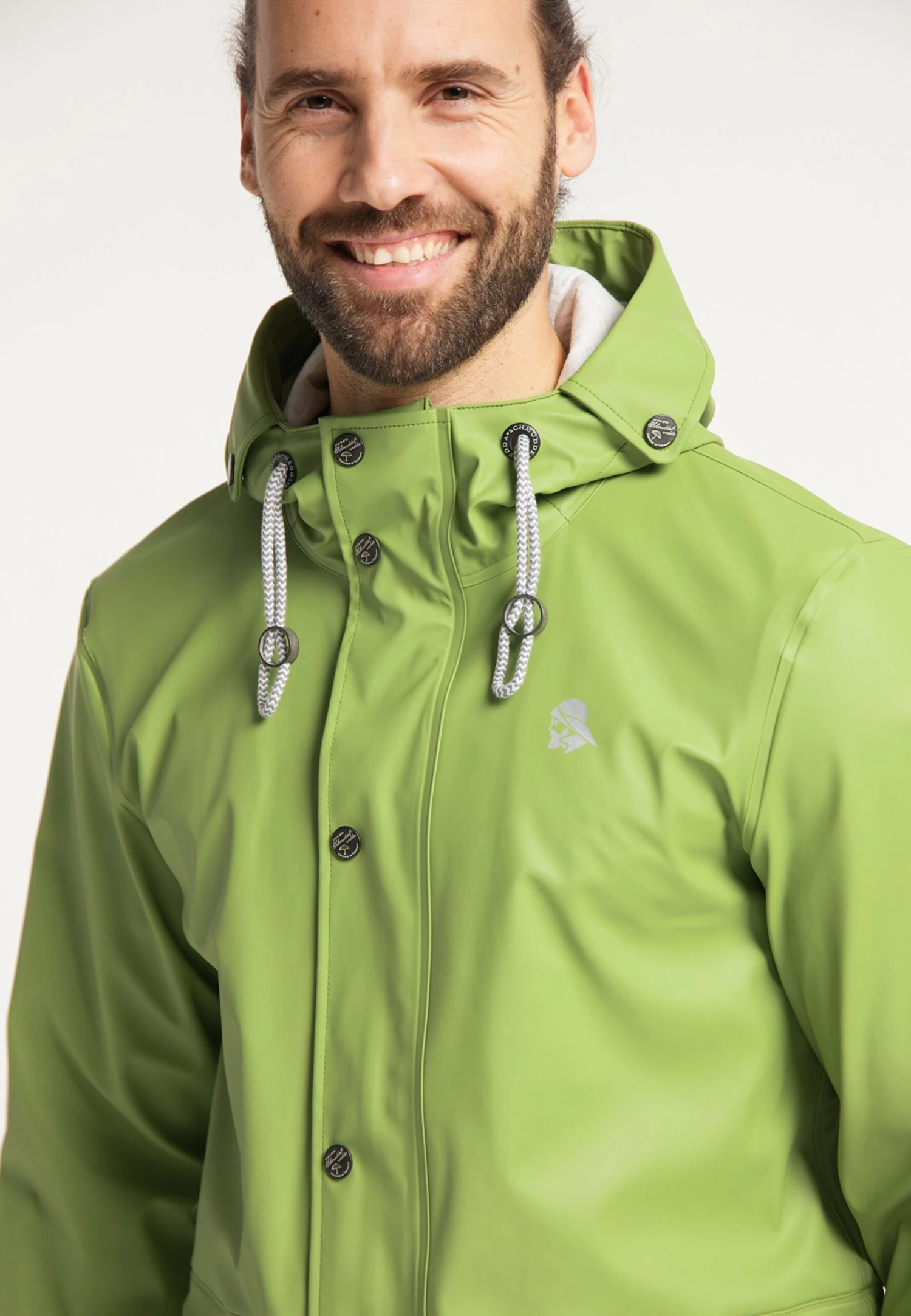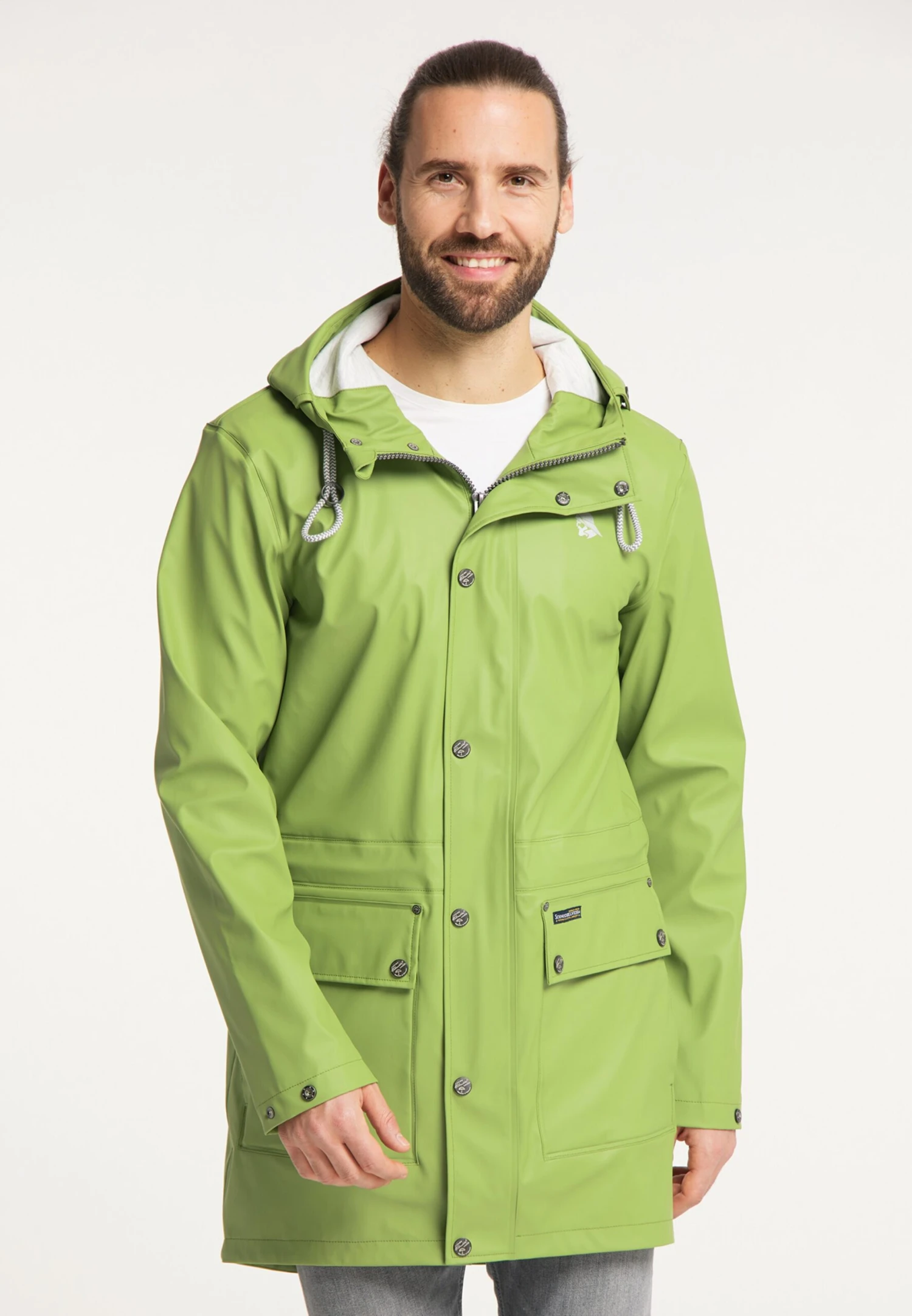 EffenRegenjasDrukknopenGevoerde capuchonRechte zoomRecht modelCapuchon met trekkoordRug inkeepStaande kraagVerborgen ritsOpzet-/flapzakZakken aan de zijkantStudsLabel patch/label flagOp staal nadenZacht opgeruwde binnenkantStevige stofLabel printWaterdichtGelaste nadenLicht gevoerd
