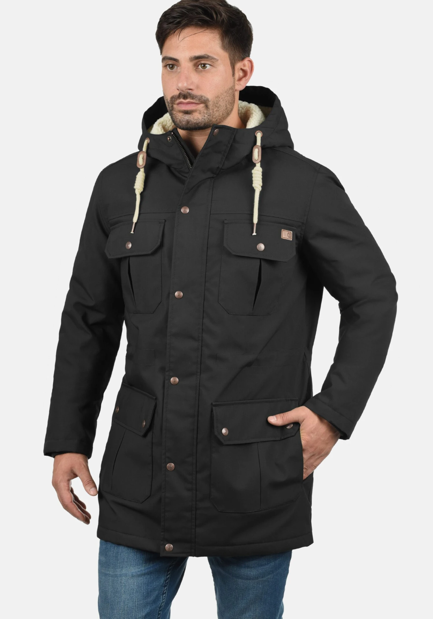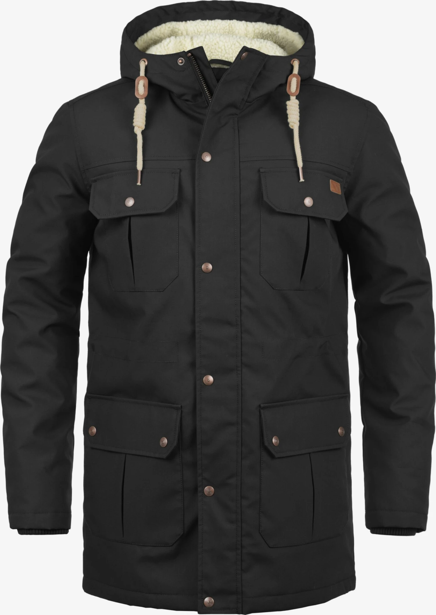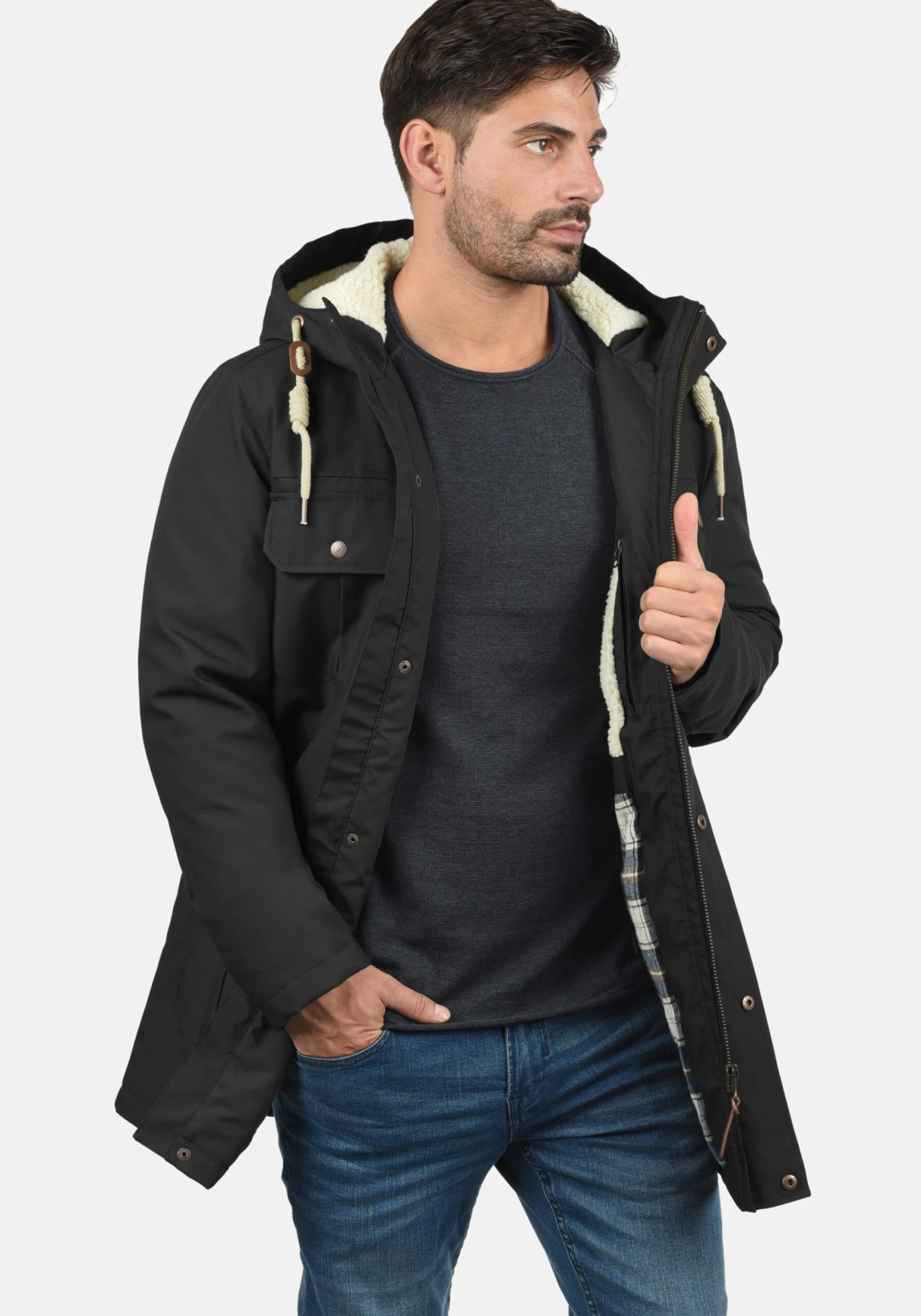 EffenGevoerde capuchonCapuchon met opstaande kraagCapuchon met trekkoordContrast voeringGeribd ceintuurtjeVerborgen ritsBorstzakBinnenzakOpzet-/flapzakTeddy voeringVerstelbare tailleLabel patch/label flagWarm gevoerd